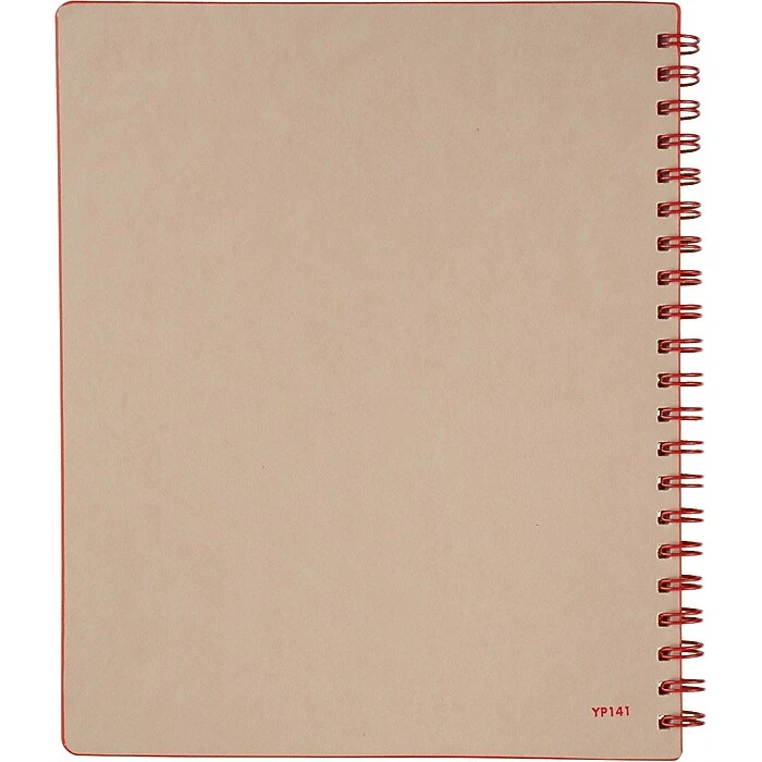 - Tan cover is accented by red trim, red wire binding and red print title/logo