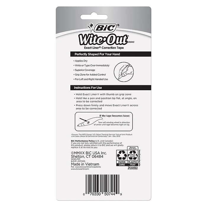 Fix errors on contracts, letters and other documents easily with these correction tapes. The natural shape and grip zone produce a comfortable hold and provide enhanced control, while the tear-resistant tape gives corrections a clean, unnoticeable appearance. These BIC Wite-Out Exact Liner correction tapes have a dry application for quick overwriting and are compact, so you can bring them on the go.