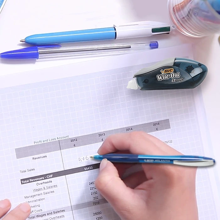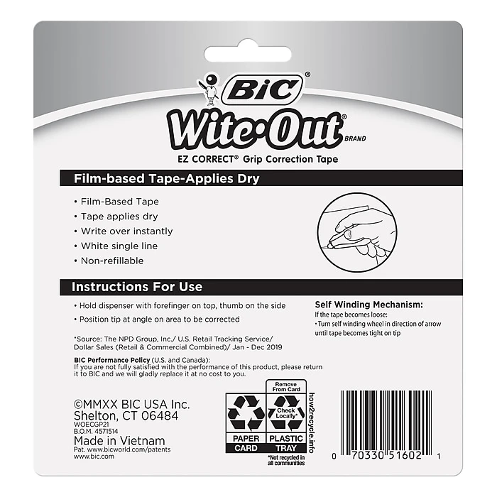 Correct spelling errors and math mistakes quickly with this correction tape that goes on dry for instant write-over. These correction tape applicators feature soft rubber grips for comfortable use. The single-line coverage of this Wite-Out correction tape is invisible on faxes or photocopies, so errors are undetectable on the final draft.