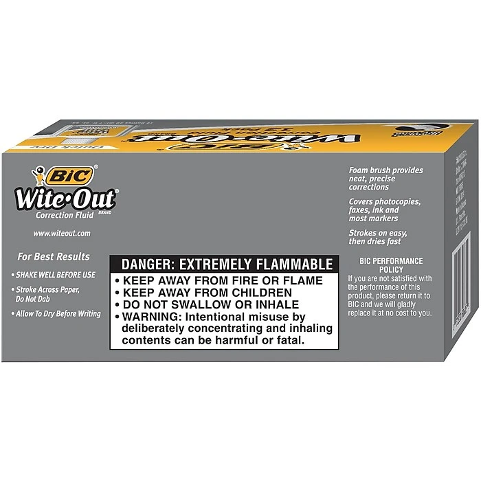 BIC Wite-Out Brand correction fluid makes it easy to eliminate typos and other minor errors in handwritten and printed documents. The white color blends into the background of most paper, minimizing the visual impact of revisions compared to the original text. A package of 12 bottles supplies your office with enough correction fluid to fix documents whenever the need arises, while a reduced dry time means employees can write new text on the document without waiting around.