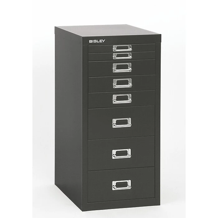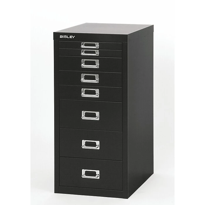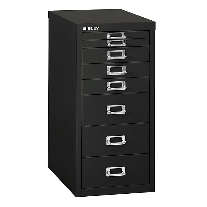 Bisleyยฎ Eight drawer under desk cabinet in black color has built-in label holders which help to identify drawer contents with ease. Cabinet is constructed with steel and has a powder coated paint finish to provide maximum durability and style.