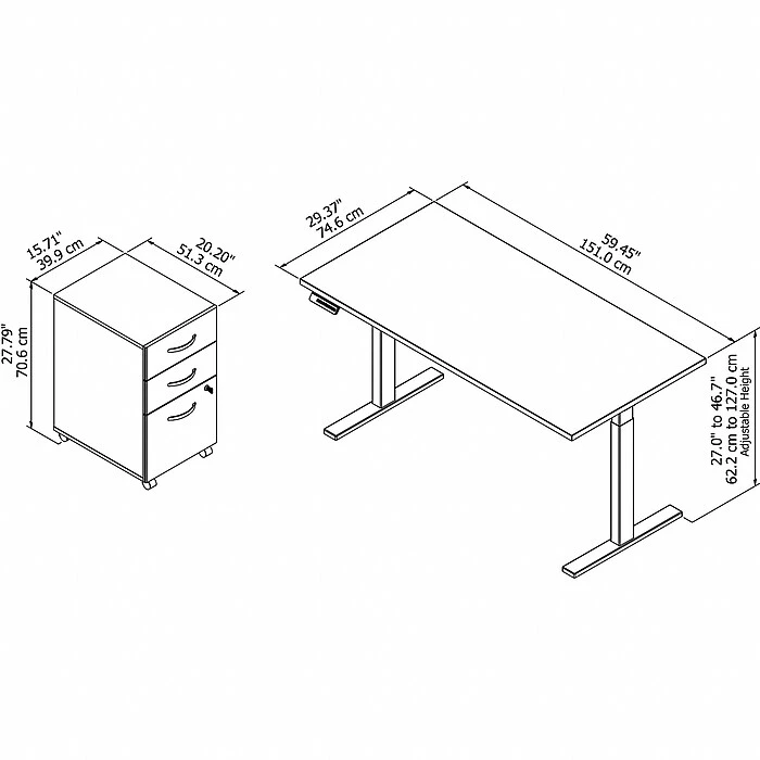 Have a healthy and productive day at the office with the Move 60 Series by Bush Business Furniture 60W x 30D Height Adjustable Standing Desk with Mobile File Cabinet. Those who use sit to stand desks report improved attitudes, energy and comfort while getting more done, and the Move 60 Series provides an affordable solution. The electric adjustable height Desk includes a 10 foot power cord and smoothly lifts from a low of 27 inches to a high of 46.7 at the push of a button. Store your favorite heights with four programmable presets so you can use them as often as you like. The 3 Drawer Mobile File Cabinet rolls with you throughout your office or remains in place as needed on any surface. A full-extension file drawer offers an easy reach to letter, legal and A4-size paperwork. Backed by a 5 Year Warranty, the Desk with Storage meets ANSI/BIFMA standards.