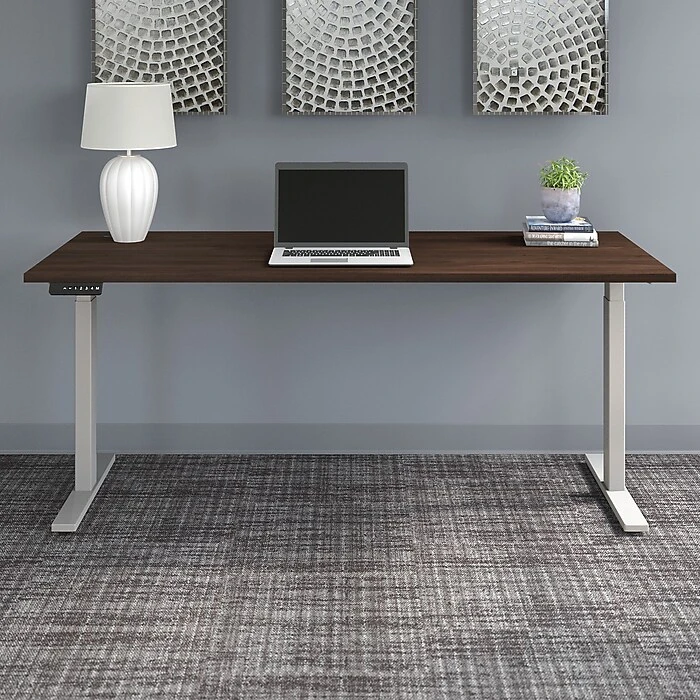 Have a healthy and productive day at the office with the Bush Business Furniture Move 60 electric height-adjustable standing desk. Those who use sit to stand desks report improved attitudes, energy, and comfort while getting more done, and the Bush Business Furniture Move 60 provides an affordable solution. The electric adjustable desk smoothly lifts from 27″ to 46.7″ at the push of a button. Store your favorite heights with four programmable presets, so you can use them as often as you like. The ergonomic desk withstands years of everyday use. A durable thermally fused laminate finish resists scratches and stains, while the sturdy steel base creates a weight capacity of up to 200 lbs. This sit-to-stand desk will have no problem holding all of your work materials. Backed by a 5-year warranty, the adjustable standing desk meets ANSI/BIFMA test standards.