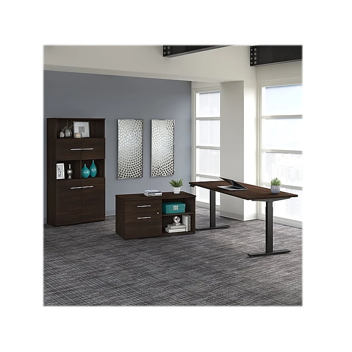 - Bundle includes: 71.02″W x 29.37″D height-adjustable standing desk, 44.21″W low storage cabinet with drawers and shelves, and 35.67″W five-shelf bookcase with doors