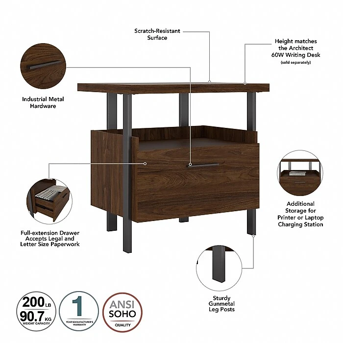 Organize important paperwork and reference materials with a home office storage solution that shows off your unique sense of style. The Bush Furniture Architect one-drawer lateral file cabinet features a simple, durable design made with contrasting materials that reflect a modern industrial aesthetic. Tbe single file drawer opens on smooth, full-extension ball bearing slides for an easy reach to legal and letter-size documents. The upper storage space can be used to store books, binders and more while the top surface makes a great printer stand or laptop charging station. Gunmetal leg posts give the small bookshelf with file drawer its structural strength in addition to complementing the Modern Walnut finish to create a distinct look. This file storage cabinet is tested to meet ANSI/SOHO quality standards for safety and performance and is backed by a 1-year manufacturer limited warranty.