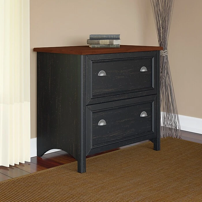 Blend style and functionality in your home office with the Bush Furniture Fairview 2 Drawer Lateral File Cabinet in Antique Black. The charming Hansen Cherry top surface and beautiful Antique Pewter hardware accents blend perfectly with existing decor. Height matches the Fairview Computer Desk (sold separately) for an extended work surface when positioned side-by-side. Full-extension file drawers glide on smooth ball bearing slides for easy access to letter, legal or A4-size files. An interlocking drawer mechanism prevents tipping for added safety. Fairview meets ANSI/SOHO quality test standards for performance and safety and comes with a Bush Furniture 6 Year Manufacturer’s Warranty. With casual styling and traditional detail, Fairview offers an alluring appearance without sacrificing functionality. See the full collection for coordinating home and office items available.