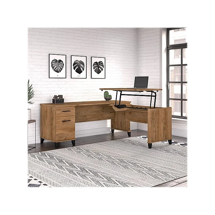 Upgrade your personal workspace with the ergonomic Bush Furniture Somerset three-position sit-to-stand L-shaped desk. As a quality alternative to desktop risers, the innovative 41″W x 24″D sit-to-stand return offers all the health benefits of a standing desk with the versatility of more expensive electric height-adjustable options. The built-in mechanical lift-and-lock system allows the desktop to lock into place at standing heights of 35″, 38″, and 41″ and easily returns to a seated position. The office desk includes a file drawer that opens on full-extension ball bearing slides for easy access to legal- and letter-size documents in addition to a box drawer for supplies and utensils. Fixed surfaces are tested to meet ANSI/SOHO standards for safety and performance while the mechanical lift is rigorously tested to Bush Furniture quality standards.