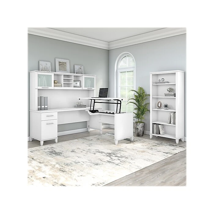 The Bush Furniture Somerset adjustable desk with hutch and bookcase offers an ergonomic solution for the home or small office. This furniture set is a perfect solution for those seeking for a stylish and functional ergonomic workspace. The mechanical Lift-n-Lock system allows the 42″W x 24″D return to lock into place at standing heights of 35″, 38″, and 41″ and easily return to a seated position. The 72″W x 24″D office desk has its own storage with a box drawer for supplies and a file drawer that holds legal- and letter-size documents. The hutch adds two frosted glass doors for concealed storage as well as open cubby spaces with two shelves. The bookcase features two fixed shelves and three shelves that can be adjusted. Fixed surfaces are tested to meet ANSI/SOHO standards for safety and performance while the mechanical lift is rigorously tested to Bush Furniture’s own quality standards. Backed by a 6-year manufacturer warranty.
