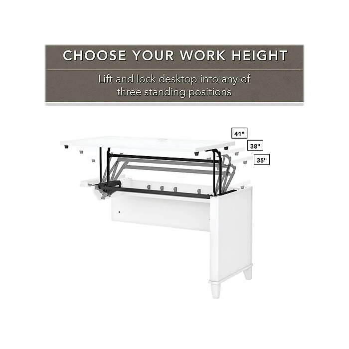 - Lift-n-Lock Desktop can be set at three standing height positions: 35, 38 or 41 inches and easily returns to seated height