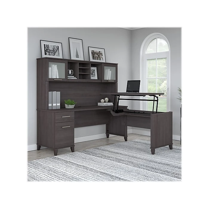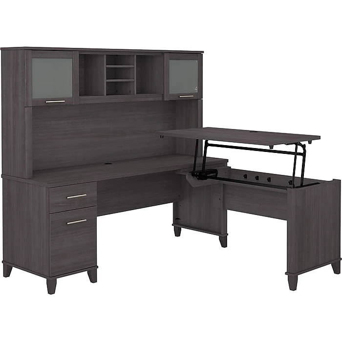 The Bush Furniture Somerset 71″W three-position sit to stand L-shaped desk with hutch offers a perfect solution for those seeking for a stylish and functional ergonomic workspace. The built-in mechanical Lift-n-Lock system allows the desktop to lock into place at standing heights of 35″, 38″, and 41″ and easily return to a seated position. This office desk includes a file drawer that opens on full-extension ball bearing slides for easy access to legal- and letter-size documents and a box drawer for supplies and utensils. The hutch attaches to the desktop and adds two frosted glass doors for concealed storage in addition to open cubby spaces with two shelves. Fixed surfaces are tested to meet ANSI/SOHO standards for safety and performance while the mechanical lift is rigorously tested to Bush Furniture quality standards.