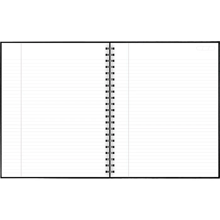 - Black, hardbound linen covers with twin wire binding protect notes and provide professional appeal. 8 7/8″ x 11″ page size