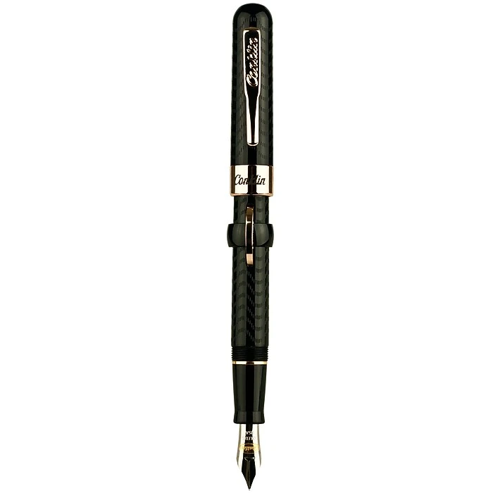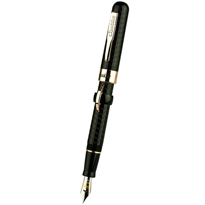 Conklinยฎ Mark Twain crescent fountain pen made of cellulose acetate material features rose gold or chrome plated accents and prevents crescent depression with a locking ring. Black chased pen in rose gold trim has fine pointed type nib.