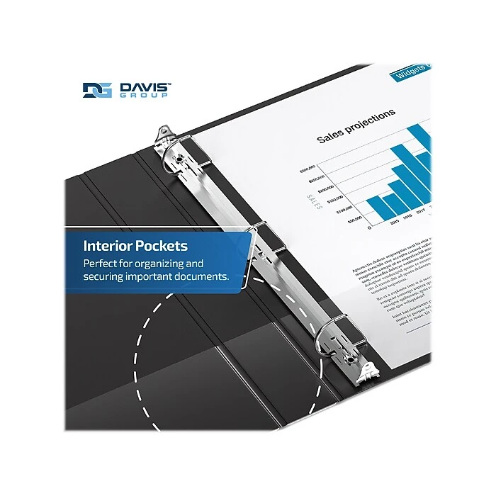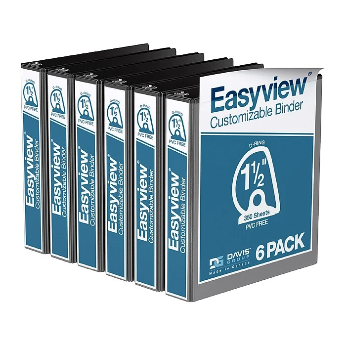 This Davis Group Easyview Premium customizable view binder is great for presentations, manuals, projects, reports, and more. The front cover, spine, and back cover feature an ink transfer resistant clear overlay, allowing you to customize each binder and make it your own. Complete with clear interior front and back cover pockets for loose document security. Back-mounted rings allow pages to lie flat. Made of PVC-free polypropylene material for enhanced durability. 100% recycled board with 85% post-consumer waste.