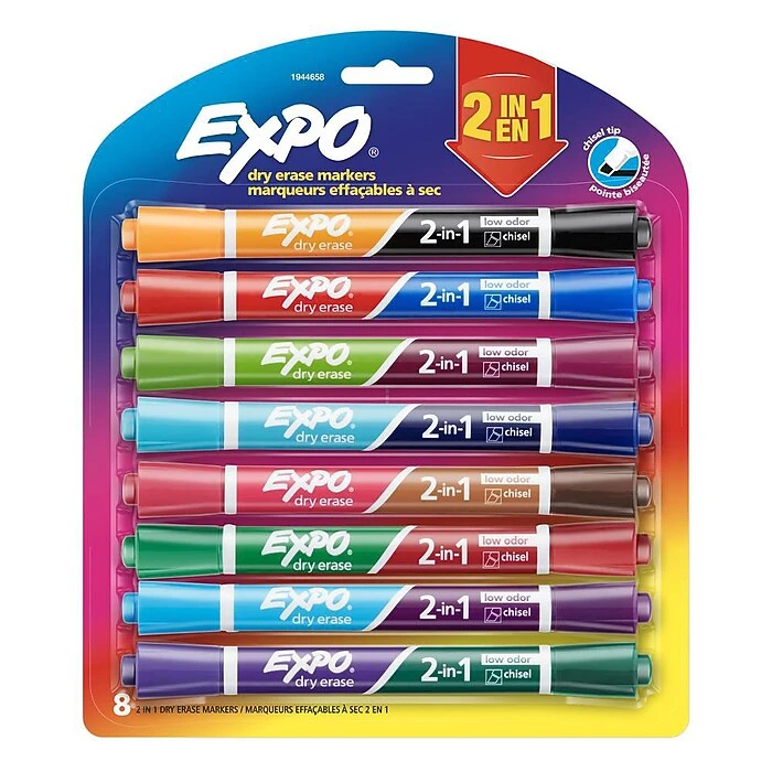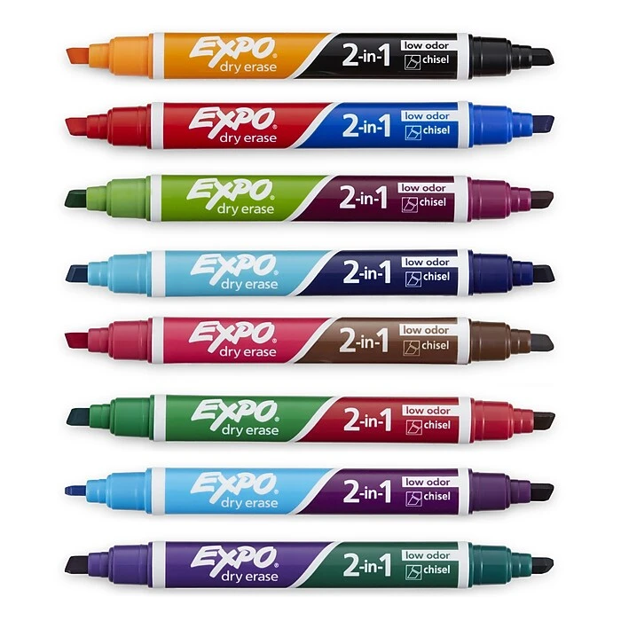 Create detailed schedules, diagrams, and presentations with the varied hues of these dual-tip dry-erase markers. In addition to providing a range of color options, these Expo dual tip markers feature chiseled nibs that provide three options for line width. This pack includes 8 low-odor Expo 2-in-1 dual-tip dry-erase markers to help make brainstorming sessions, instructions and project plans visually distinctive.