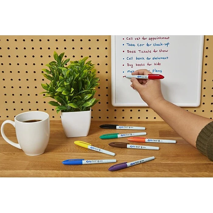 Update your office supplies with these wet-erase markers that each feature a fine point for enhanced precision and accuracy. Because these markers are non-toxic, they’re safe for children to use. These Expo Vis-a-Vis overhead markers contain a water-based ink formula that makes for a bright look on white boards or transparencies.