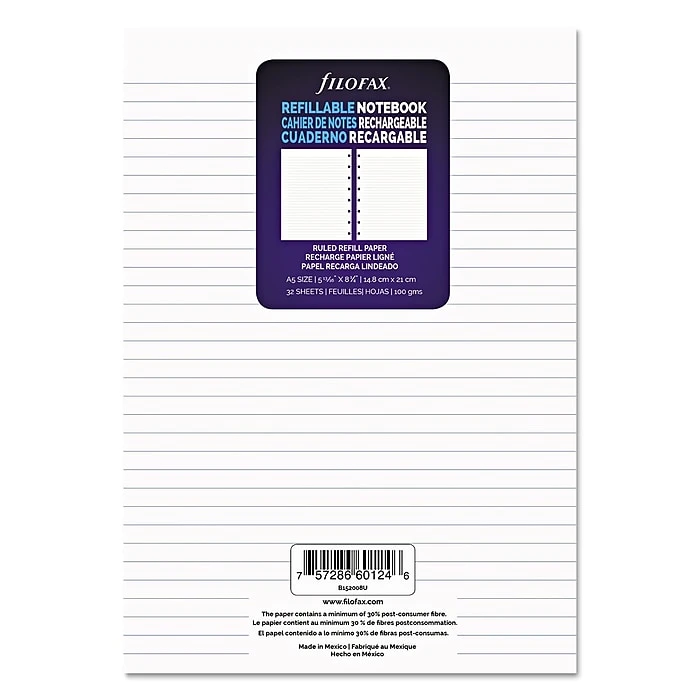 - Available A5 Filofax® Notebook Refills include: Ruled (B152008U), Unruled/Plain (B152451U), Squared/Quad (B152905U), and Dots (B152016U)