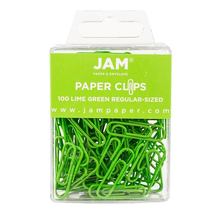 If you’re looking for the brightest way to spruce up that pile of papers on your desk or in your locker, you have stumbled upon the right page! These JAM Paperยฎ Colored Standard Paper Clips are a bright, lime green color so they stand out and get noticed no matter what. They measure 1 inch long, so they are a standard size and are perfect to use to hold together smaller documents such as receipts, coupons and more! They are made of sturdy, durable metal that is smooth so it won’t catch on anything or be breaking or bending anytime soon. Use them to keep organized around the office, at home, at school or anywhere that needs some tidying up. They are sold in 2 packs of 100.Size: 1 inch , Color: Lime Green , Quantity: 2/pack