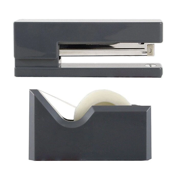 JAM Paperยฎ Grey Office & Desk Set contains 1 stapler and 1 tape dispenser. Both of these desk supplies feature a versatile and professional grey color that will look great in any work space and on any desk. The stapler in this set is made of hard plastic and lightweight steel. It features a weighted bottom and has the capacity to fit over 200 staples at one time! The tape dispenser is also made of hard and durable plastic, and also has a weighted bottom to keep it anchored to a designated spot on your desk. With the capacity to fit one standard sized roll of clear tape, this dispenser features a sharp strip of metal on the front edge to help your tear off cleanly cut pieces of tape!