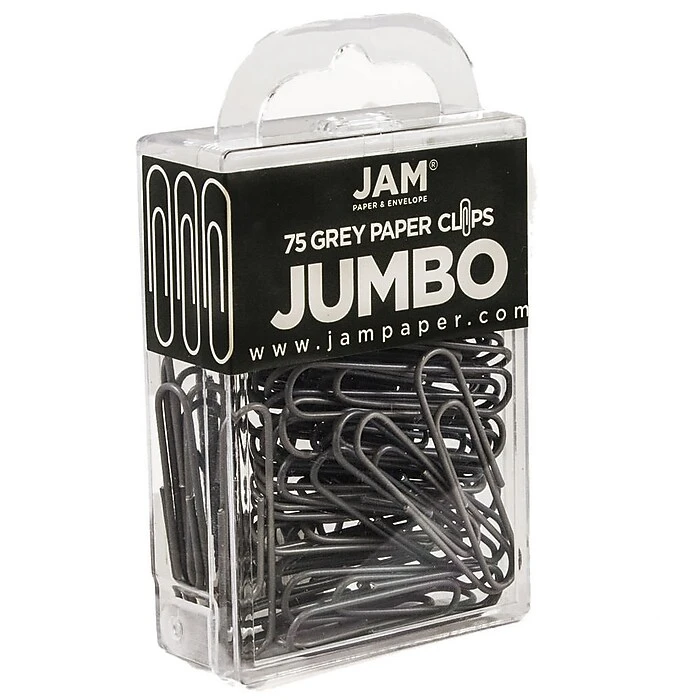 Are you in the need of ways to organize that messy desk, office, locker or binder? Look no further than JAM Paperยฎ Colored Jumbo Paper Clips! These particular paperclips are a grey color, so they are fairly neutral but they still stand out from the ordinary paper clip. These clips are a jumbo size, so they measure 2 inches long, meaning they can hold a large amount of papers securely. They are made of smooth, durable metal, so don’t worry about have the embarrassing mishap of spilling your papers all over. Use these paperclips no matter where organization may be needed, whether it’s at the office, home or school. These clips are versatile and useful for any occasion! They are sold in packs of 75.