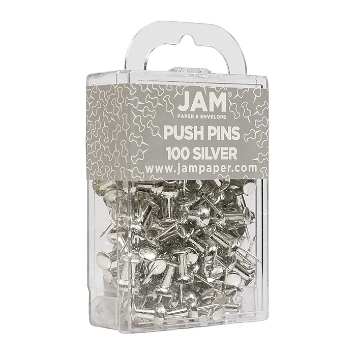 Anything worth posting should be posted in style. That’s why we have created bright JAM Paper Silver Push Pins! These durable plastic and metal pins are perfect for all your hanging needs. Hang posters, tapestries, memos, and pictures with ease. You’re not boring, so your work space shouldn’t be either! Colorful push pins are perfect for adding that little pop of color that will brighten up your whole board (and work day!). Use these silver push pins for baby shower flyers or to hang photos of your little baby boy! attached memos securely to cork board or tack boards. There is nothing these pins can’t handle. This pack contains a total of 100 push pins.