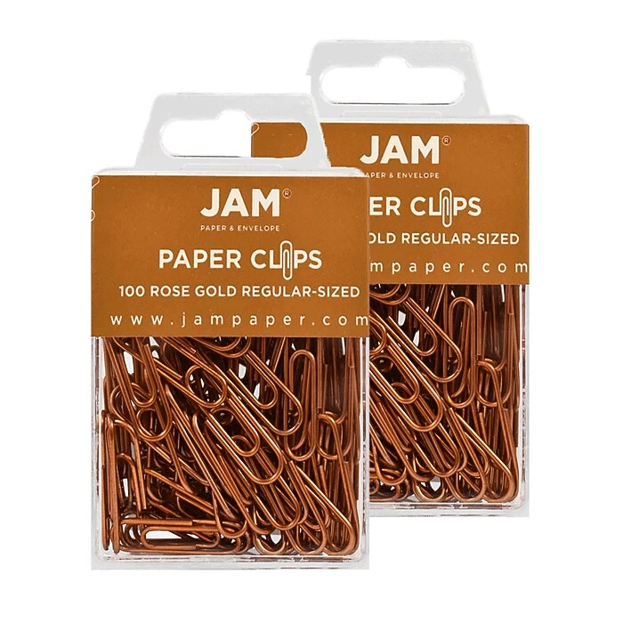 You appreciate the finer things in life, but you also like to keep it classy by keeping your refined style tastes subtle and minimalistic. If this is you, then we have the perfect accessory and organizational tool for you office! JAM Paperยฎ Small Rose Gold Colored Standard Paper Clips are made of study steel wire and are coated in shining rose gold colored vinyl. These paper clips measure 1 inch in length, meaning that they will give your projects and your office the slight hint of elegance you are looking for! Each box contains a total of 100 paperclips. Use them to clip documents, files, memos, cash, checks, files, receipts and other papering together securely and easily. Size: Small , Color: Rose Gold , Quantity: 2/pack