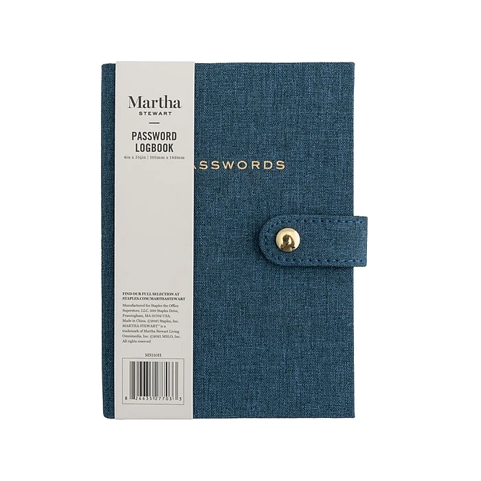 The Martha Stewart password book provides room to write URLs, usernames, passwords, and notes. Made of high-quality faux leather with a linen texture. Contains 144 ruled pages.
