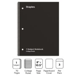 Staples 1-Subject Notebook, 8.5″ X 10.5″, College Ruled, 70 Sheets, Black, 3/Pack (TR58373)