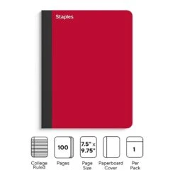 Staples Premium 1-Subject Notebook, 8.5″ X 11″, College Ruled, 90 Sheets, Red (TR58357)