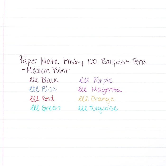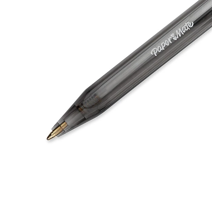 Paper Mate InkJoy 100RT retractable medium-point black ballpoint pens spread ink easily, so you can keep taking notes late into the day. The retractable design helps prevent messes on clothing and office furniture.