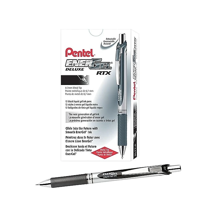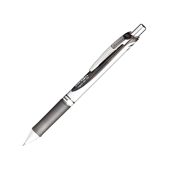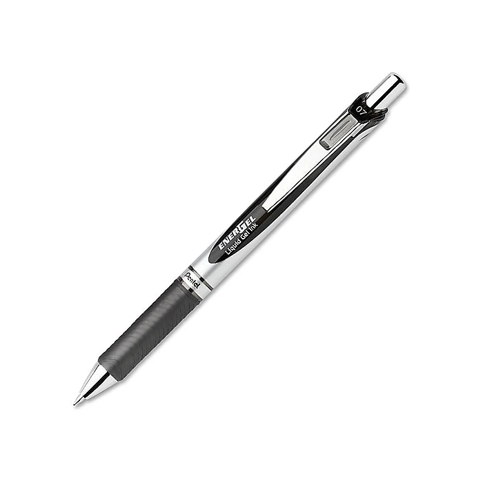 Experience the reliability of these medium-point metal-tip retractable black liquid gel-ink pens. The contemporary design offers a sophisticated appearance, while the medium point delivers a smooth, consistent flow of ink. These Pentel EnerGel metal-tip black liquid gel-ink pens are retractable and come in a pack of 12, so stocking up is simple.