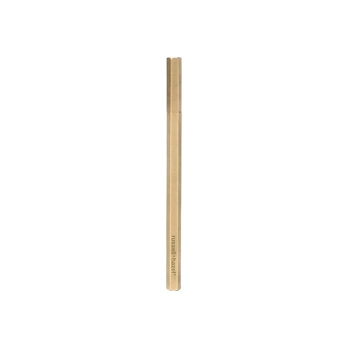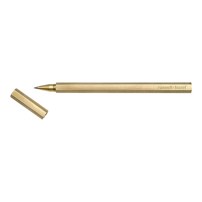 This sleek and minimalist pen is crafted from solid metal with hexagonal barrel that allows for a secure and comfortable grip. The gold-tone finish defines the simple yet sophisticated aesthetic that is Russell+Hazel. A magnet on the cap is a smart way to keep it together. Due to the unique nature of the brass accents, the pen may come with a more weathered, vintage look. If the desire is for a shinier finish, it is suggested using brass polish to enhance the look.