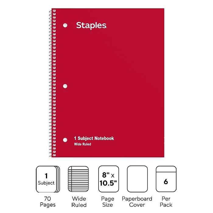 Stock your paper supplies cupboard with these assorted-color 1-subject notebooks. A spiral-bound design makes it easy to turn the pages, while the wide ruling ensures notes are large and easy to read. With six notebooks in the pack, these TRU RED 8 x 10.5-inch assorted-color 1-subject notebooks ensure you have paper on hand when you need it.