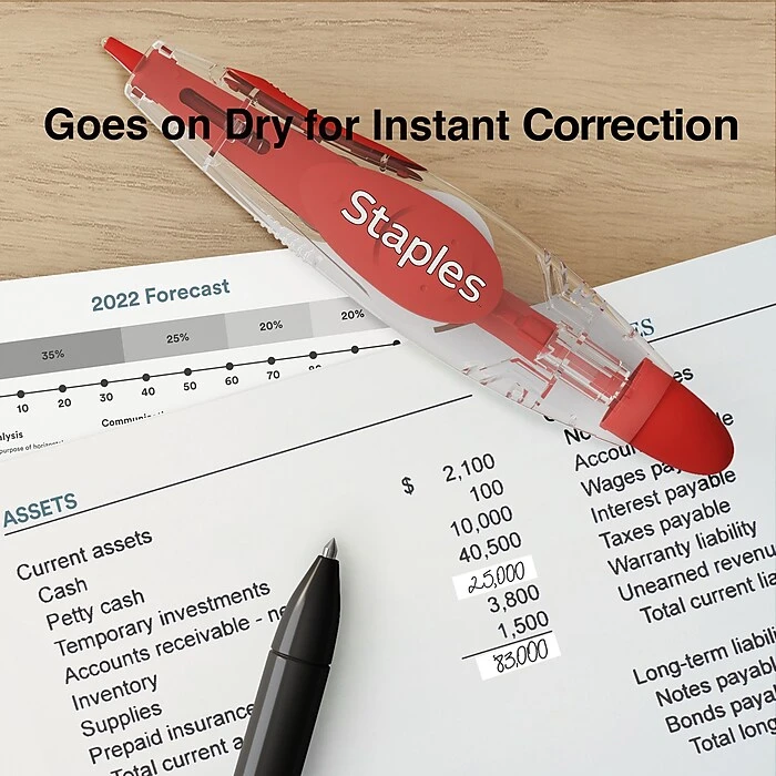 Submit professional-quality documents with these pen-style correction tapes. The retractable design helps keep the tape damage-free when not in use, while the pen-style configuration allows for easy application. With a fast-dry formulation, this essential office supply lets you undo multiple errors cleanly and quickly. These Staples pen-style correction tapes roll out smoothly for hassle-free use and leave no shadows on documents for spotless copy.