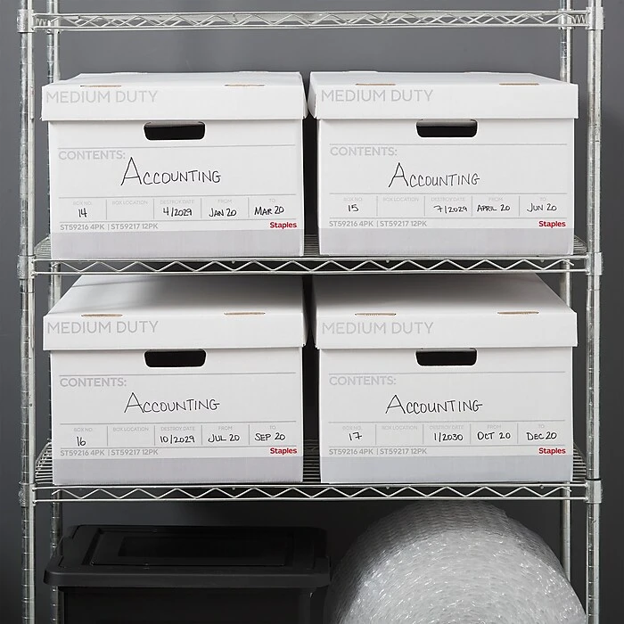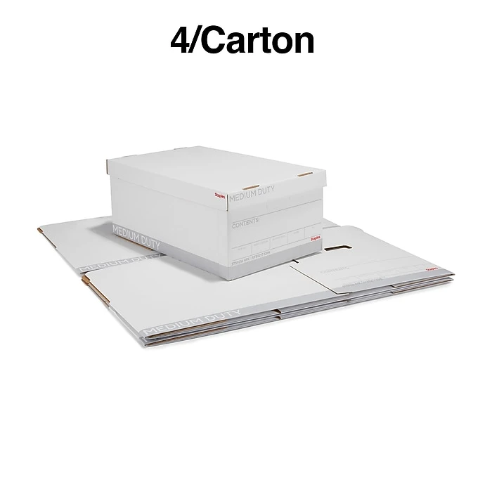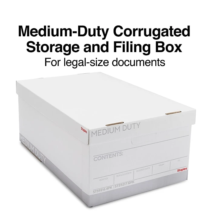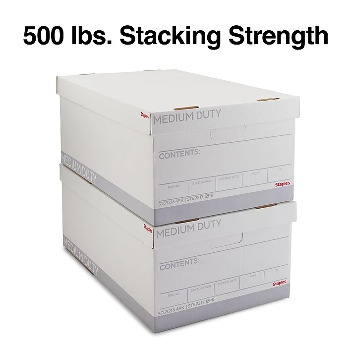 Organize your office space with these corrugated medium-duty storage boxes. The easy-grip handles offer enhanced portability around the office, while the medium-duty stacking strength is ideal for use with or without shelving. These Staples corrugated medium-duty storage boxes feature a preprinted write-in area for labels to support organization and a lift-off lid to keep out dust and debris.
