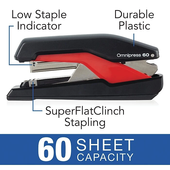 - A durable plastic body with inner metal construction and patented Omnipress® technology is combined to create a one-of-a-kind stapler