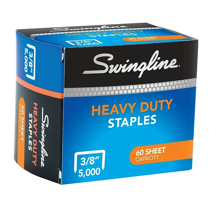 Swingline® Heavy Duty Staples work with all heavy-duty staplers and securely fasten up to 60 sheets of 20-lb. paper. Sharp chisel point pierces better and jams less. 3/8″ leg length. 100 per strip, 5,000 per box.