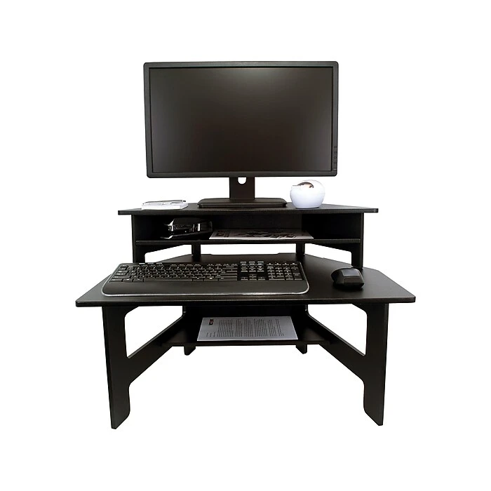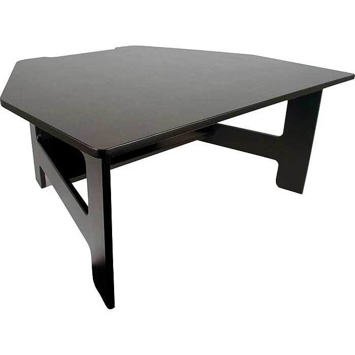 Transform a sitting desk into a standing desk with this desk converter, and reap the ergonomic benefits. The portability of the riser makes it convenient to place on any desk or table, creating an instant workspace. The wide surface can hold monitors, keyboards and other office accessories on top, while the tapered back of the desk converter conforms to corner spaces. The laminate coating on this Victor Technology standing desk converter ensures durability.